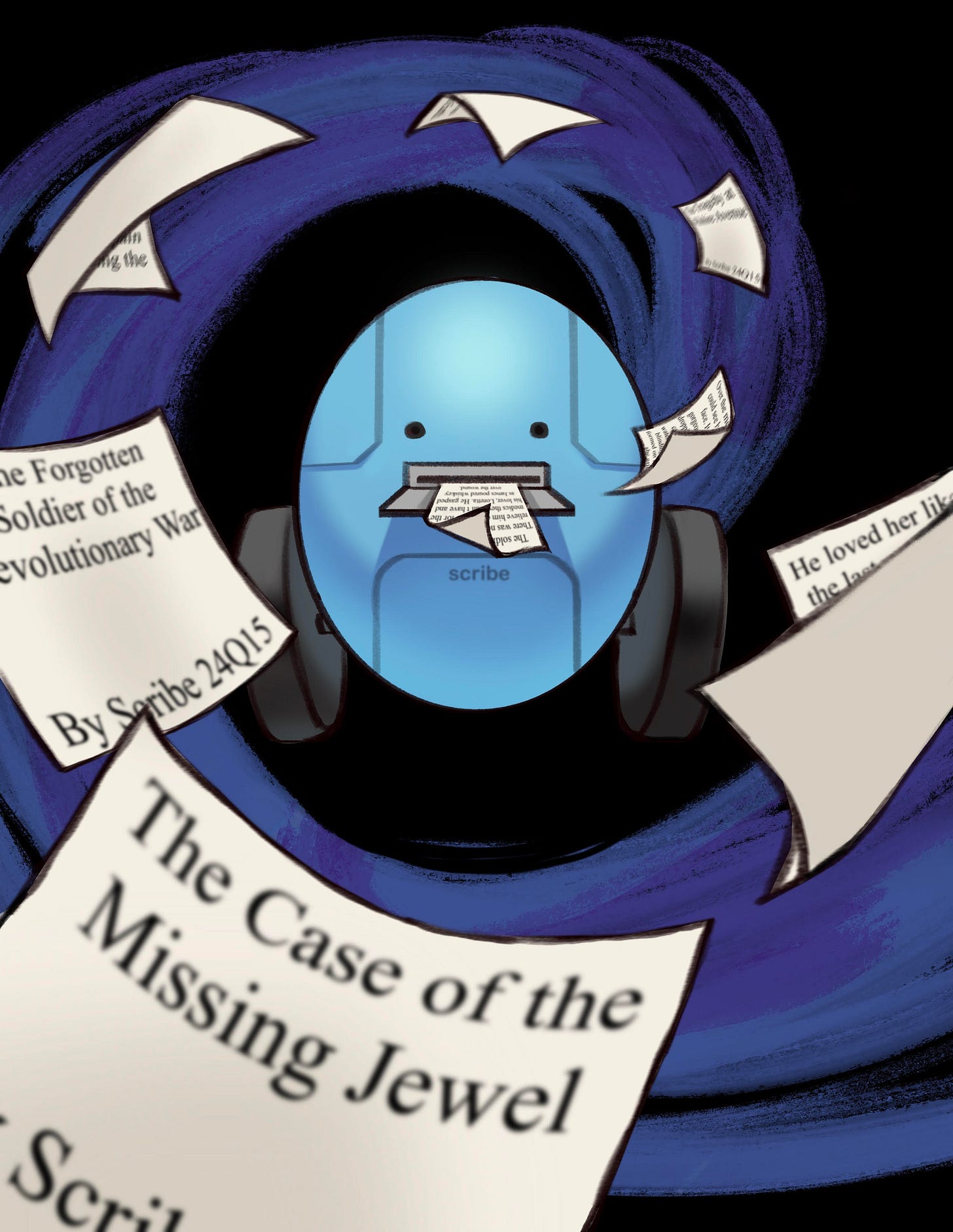 A few seconds later, Scribe wheeled in. Henry always smiled at the sight of his little friend: just a few feet tall, with a round blue body, and two metallic gray eyes. Scribe’s printer